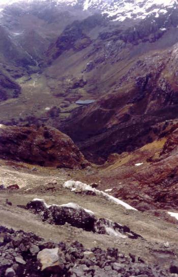 Blick von der Punta Ulta (4.890 m) zum Talboden der Quebrada Ulta. |
